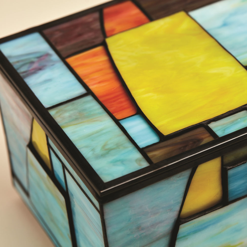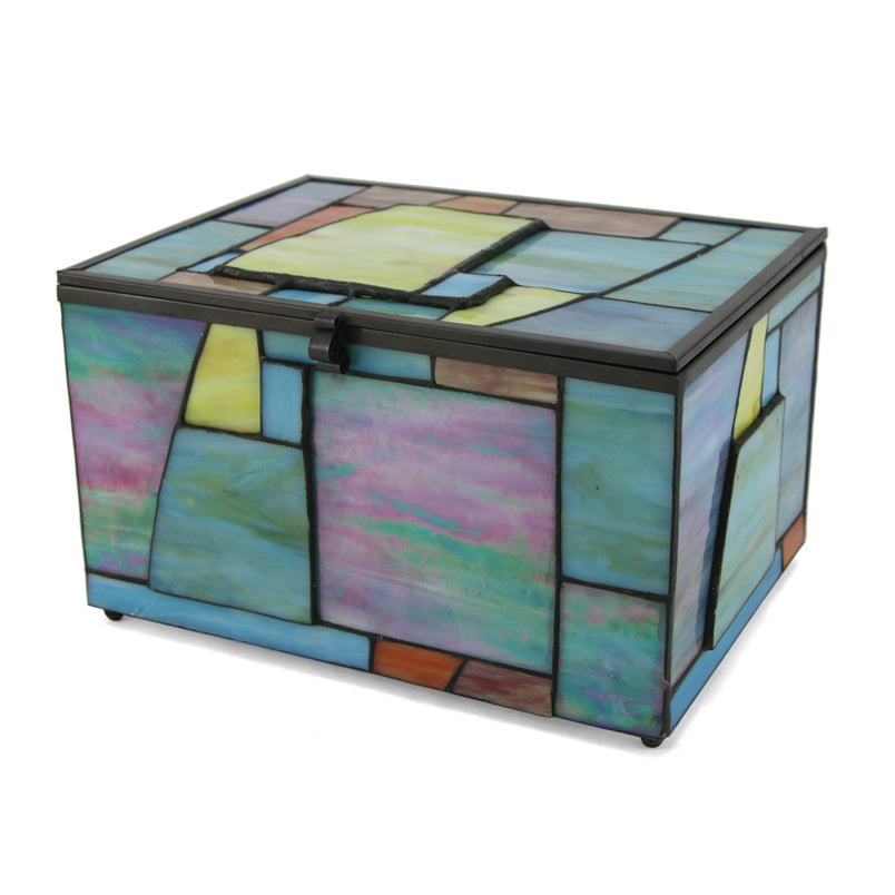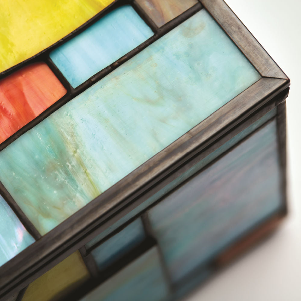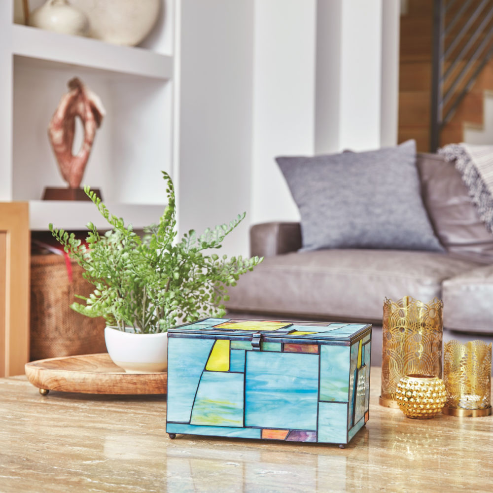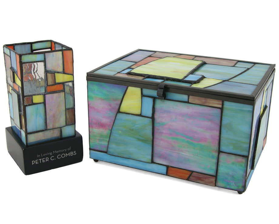 Created from hand-cut pieces of stained glass, the Paragon Geometric Memory Chest and the Paragon Keepsake Light represent artistry and excellence. The designs feature eye-catching shades of green, turquoise, purple and amber along with some sections raised to add a touch of whimsy.